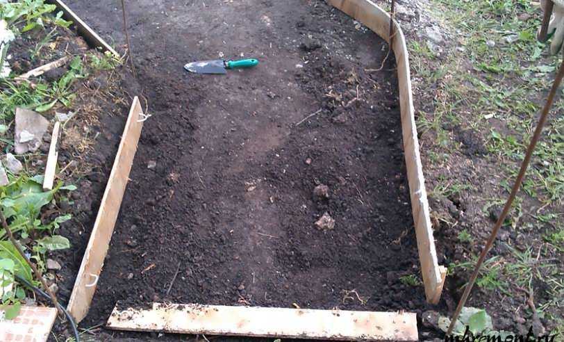 Первичная подготовка проводится, как описано выше – разметка, удаление грунта из траншеи, отсыпка и трамбовка. Далее необходимо установить опалубку.