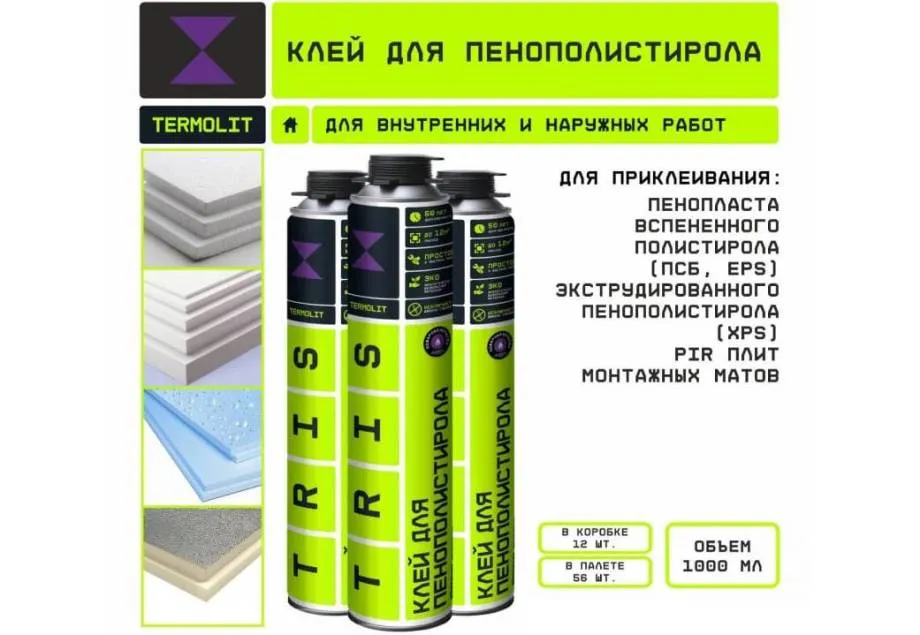 - Для пенопласта. Пригодна для применения внутренних работ в жилых массивах. Отличается огнеупорными и экологическими качествами.