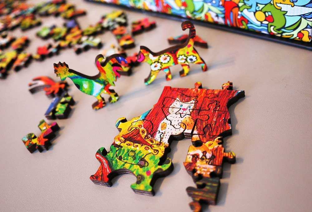Очень популярны сейчас и радужные фигурные пазлы в виде животных — львов, сов, бабочек и так далее. В год Тигра особенным спросом пользуется… тигр. Любопытно, что сами детальки создатели таких пазлов делают не абы какими, а тоже в виде каких-то других животных.