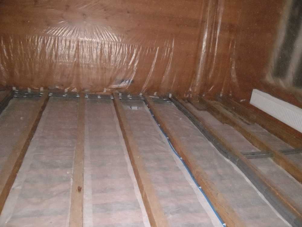 - поверх них укладывается тепло- и звукоизоляционный материал – идеальным решением будет минеральная вата;