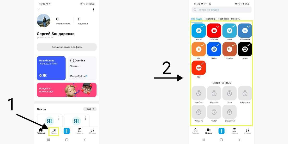 Чтобы просматривать видеоролики, нажмите на значок видеокамеры слева от синего плюсика. При желании можно настроить ленту видеохостингов. Например, если вы не хотите смотреть видео из Ютуба, просто снимите галочку – ролики оттуда не будут попадать к вам. А если передумаете, ее в любой момент можно добавить обратно.