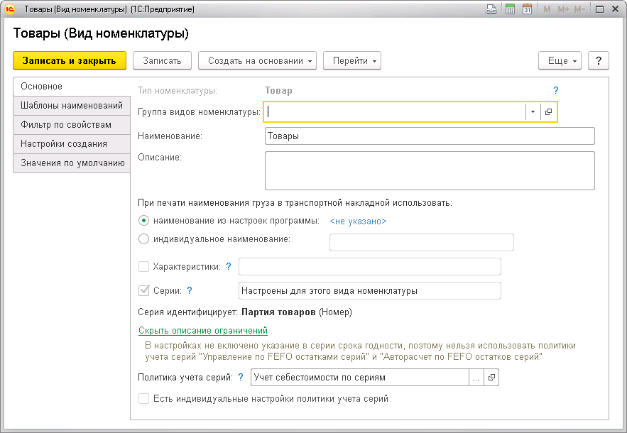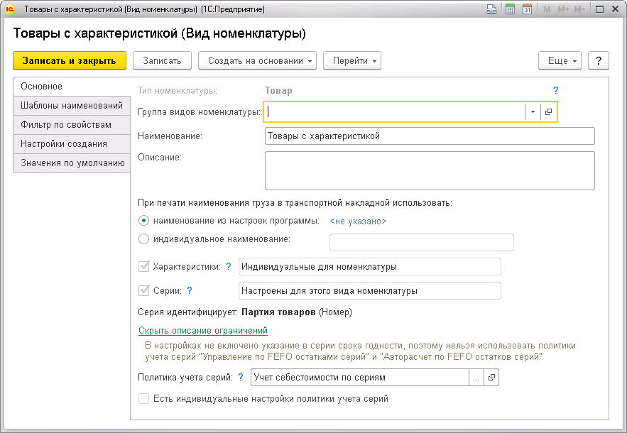 Вариант использования характеристик для данного вида номенклатуры. Можно выбрать значения: Не использовать, Использовать общие для вида номенклатуры, Использовать индивидуальные для номенклатуры.