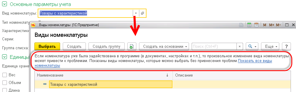 Возможность выбрать другой вид есть, но проверки не проходит. В нашем примере у товара с видом номенклатуры «Товары с характеристикой» устанавливаем новый вид «Товары»:
