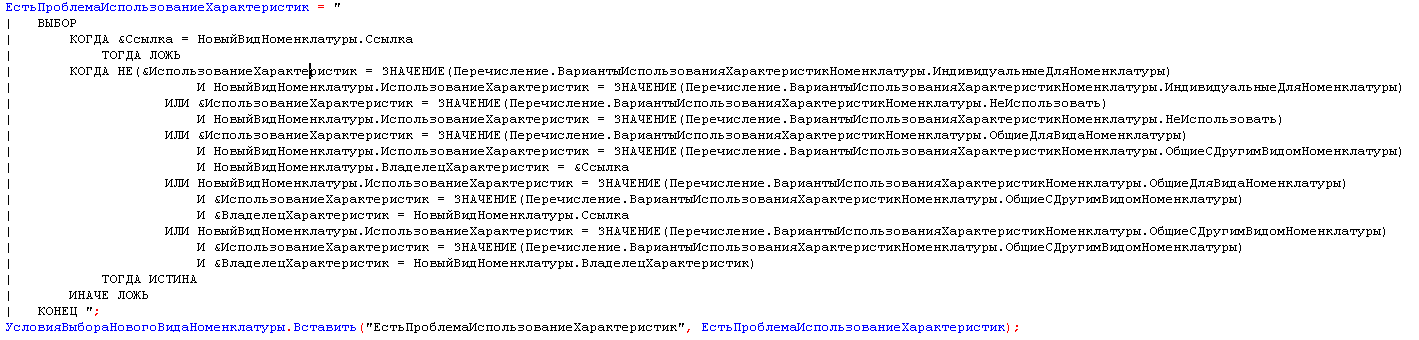 - ИспользованиеХарактеристик — тип ПеречислениеСсылка.ВариантыИспользованияХарактеристикНоменклатуры