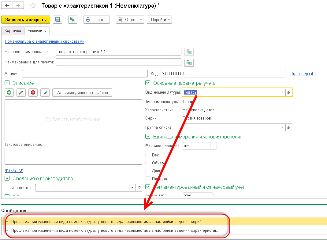 При ручном изменении вида номенклатуры в уже записанной карточки товара программа сообщает:
