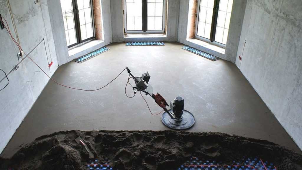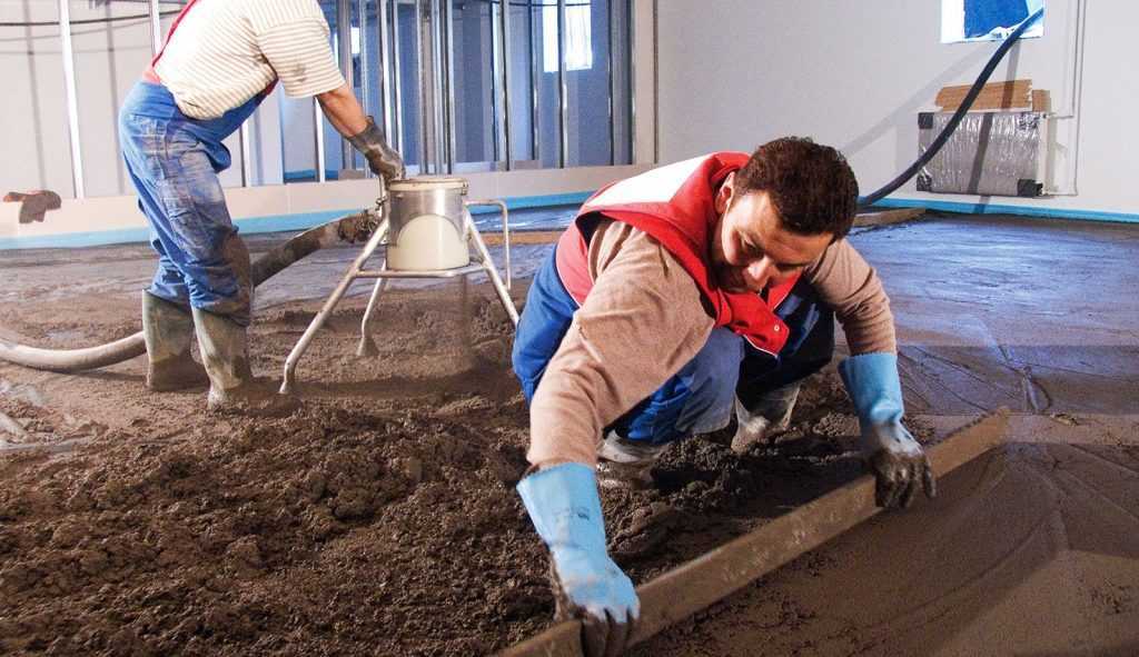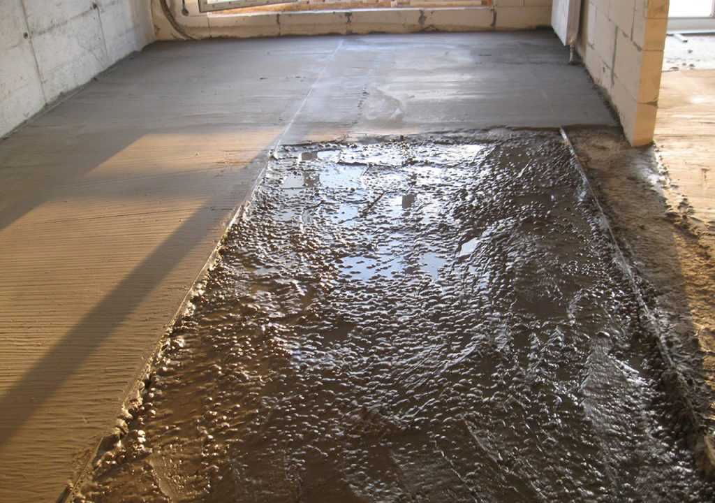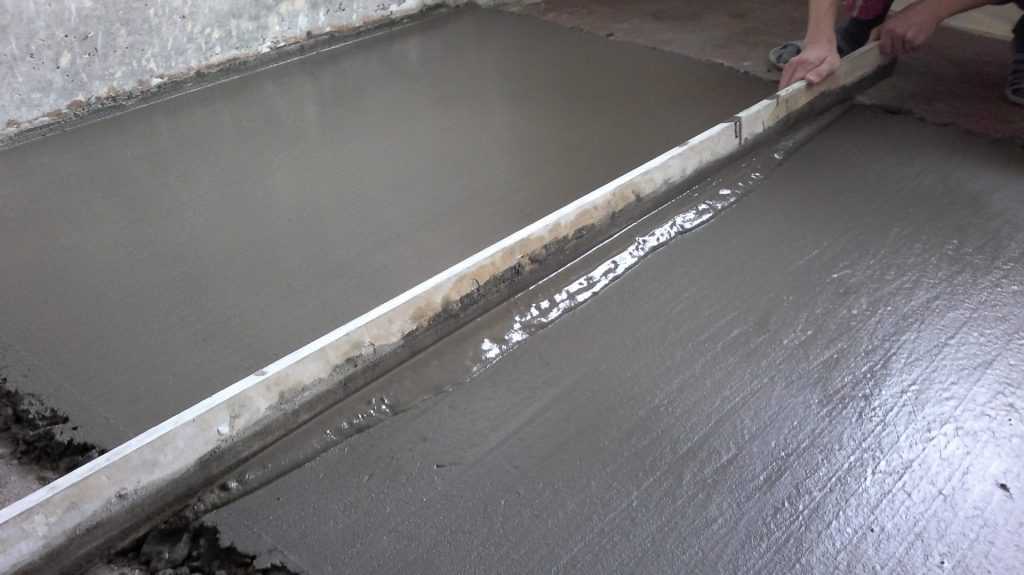 - бетонная стяжка — сбивается старое бетонное покрытие, и на подготовленную поверхность с помощью утеплительной подушки или без нее, заливается новая, идеально ровная цементная стяжка,