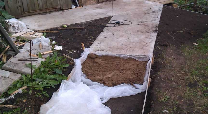 Дно дорожки тщательно утрамбовывается и при необходимости укладывается гидроизоляционный слой: агроволокно или геотекстиль. Гидроизоляция увеличит морозостойкость конструкции и предотвратит коррозию арматуры. Далее насыпается слегка увлажненный песок, который необходимо разровнять граблями для устранения пустот. Подготовленную подушку нужно хорошо утрамбовать и выровнять, что позволит равномерно распределить бетонную смесь.