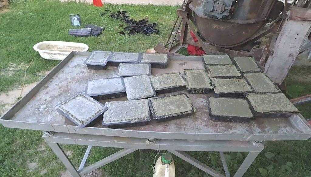 - После первичного застывания (не менее часа!) смеси извлечь форму, переложить ее в новое место и снова наполнить ячейки бетоном. С учетом небольшой скорости твердения, для быстрой работы желательно иметь несколько форм.