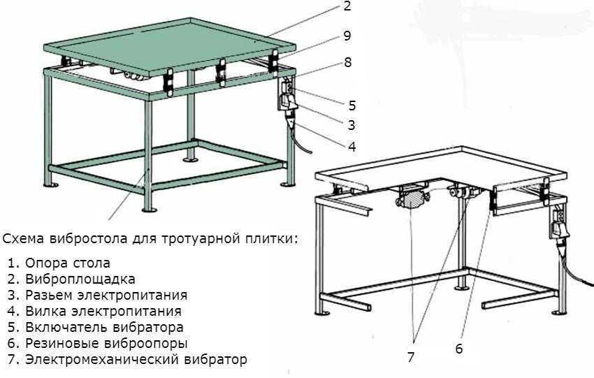 На фото показан самодельный вибростол. Это приспособление необходимо для того, чтобы превратить обычную бетонную смесь в более прочный и стойкий к внешним нагрузкам материал. Устройство такого стола показано на схеме ниже.