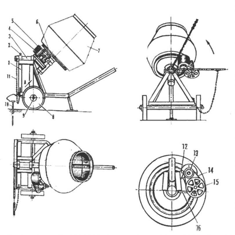 Каждая или почти каждая бетономешалка, сделанная своими руками, имеет какие-то оригинальные решения. Мало кто повторяет конструкцию полностью, не внося каких-либо изменений — приходится подстраиваться под те детали и узлы, которые есть в наличии. Некоторые интересные решения есть в фото.