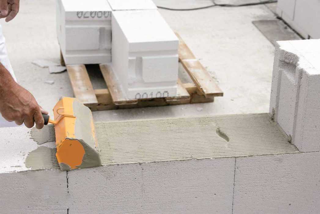 Этот вид раствора также используется для кладки блоков. Главной особенностью считается простота изготовления, а также надежность создаваемого ими крепления. Чтобы выполнить укладку блоков, используются аналогичные последовательности в приготовлении, что и при работе с клеевым раствором.