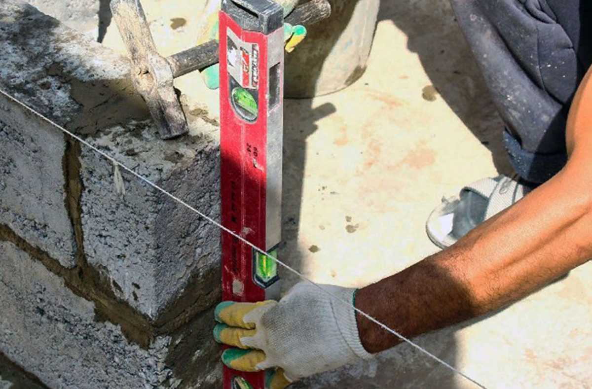 Первый ряд должен получиться идеально ровным, поэтому для контроля обязательно используют шнур-причалку и уровень. Подправляют установку блоков резиновой киянкой.