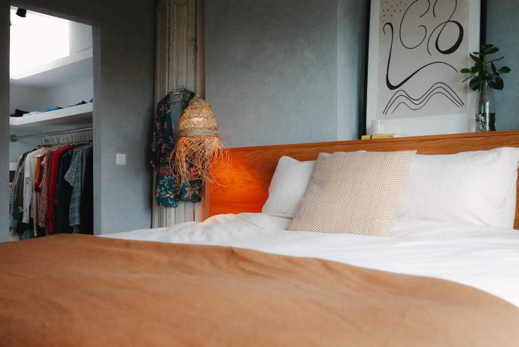 Бетон в спальне можно использовать для декора акцентной стены или поверхности пола. Материал отлично смотрится в сочетании с деревянными панелями, лаконичной мебелью и натуральным текстилем.