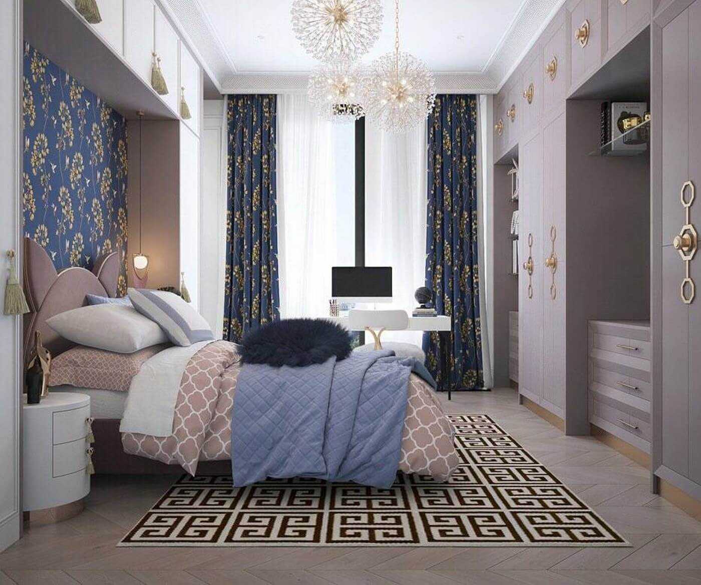 В декоре спальни на передний план выходят цвет и фактура текстиля. Фиолетовые, сиреневые, сизые, дымчатые букле, плюш, бархат, шёлк, шерсть, сатин, мех — все ткани, к которым хочется прикасаться, — станут в этой зоне центром притяжения внимания