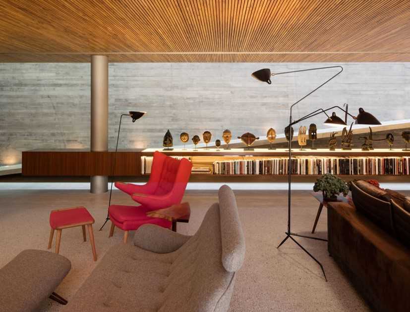 Немного шершавая поверхность бетона отлично смотреться в контексте гладкого потолка, изготовленного из дерева. Подобный дизайнерский ход создаёт особую атмосферу, позволяющую достичь высшей степени спокойствия и душевного равновесия.