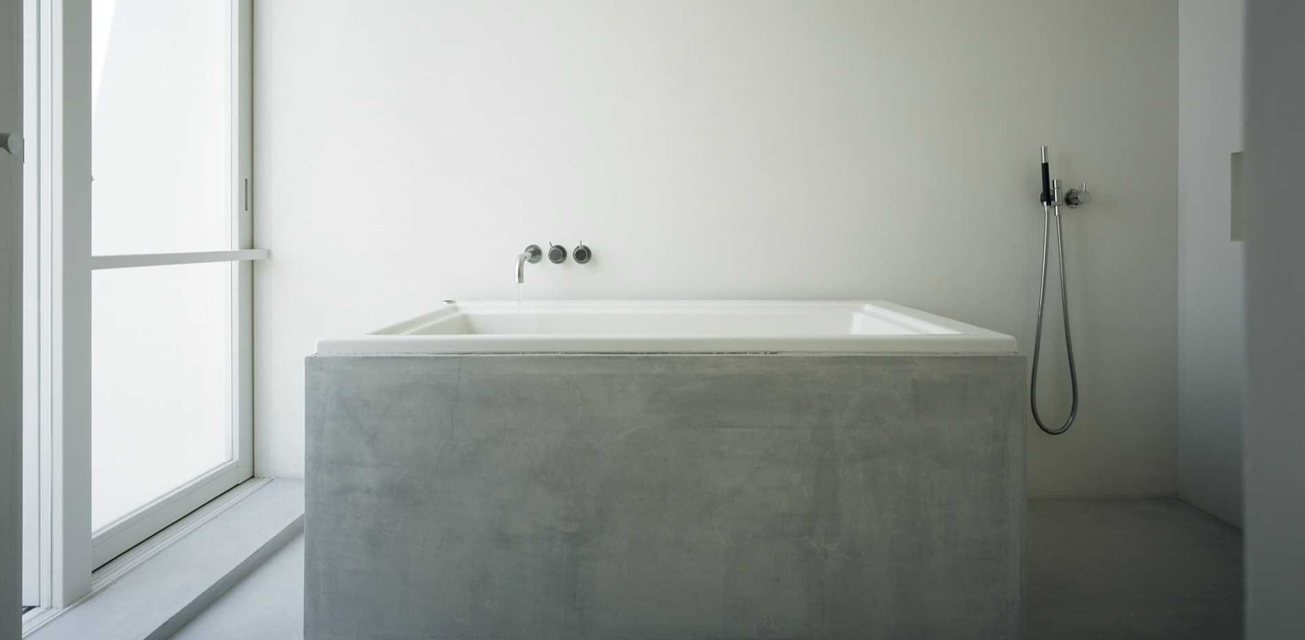 В ванной комнате бетонное покрытие может заменить привычную всем кафельную плитку. Также бетон может использоваться для отделки основы под раковину или ванну.