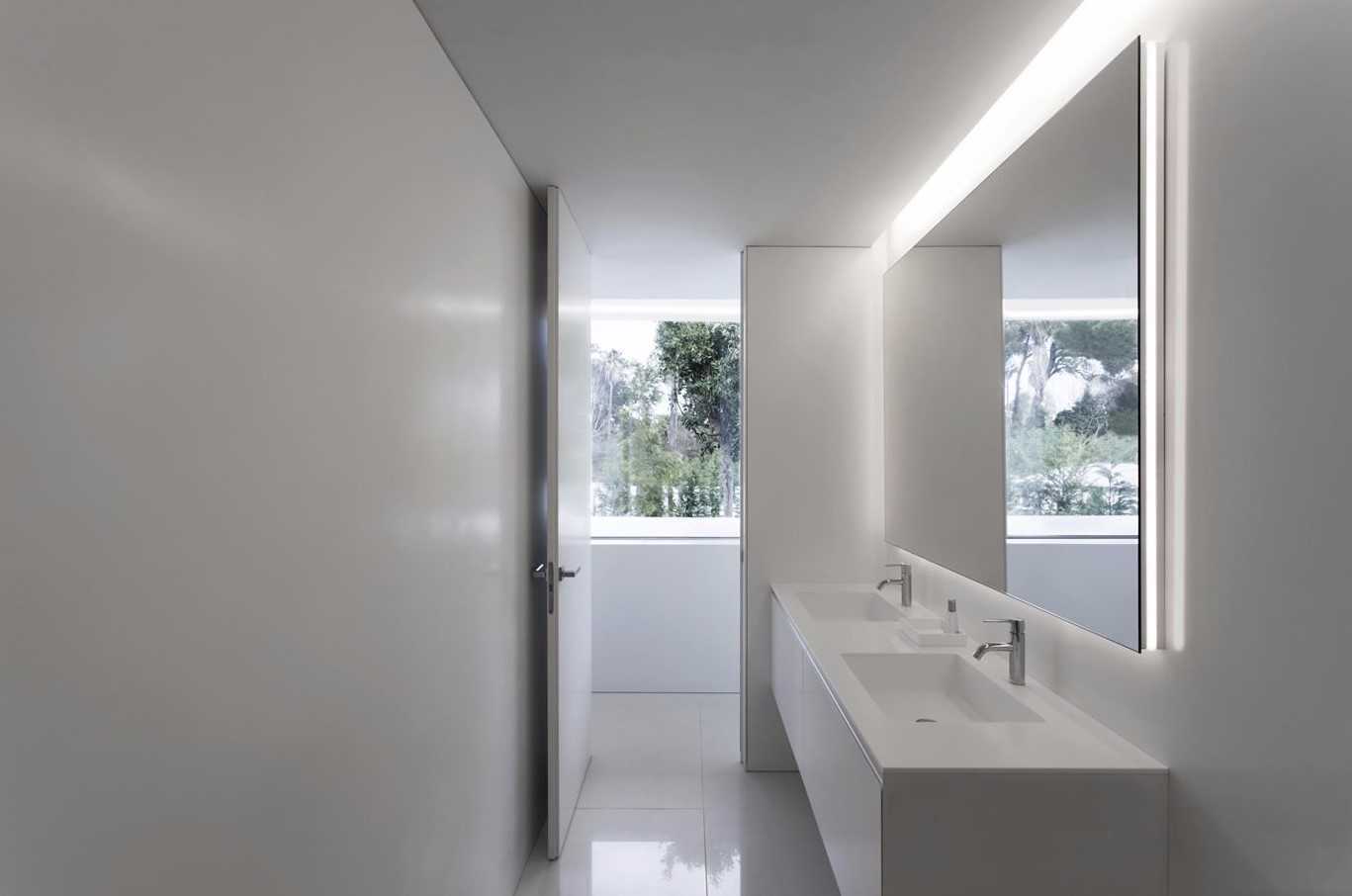 - Мягкость и комфорт строгой ванной комнате придадут коврик, махровые полотенца и подвесные светильники. Большое количество зеркал, глянцевая белая мебель и плитка на полу разбавит серую шершавую стену.