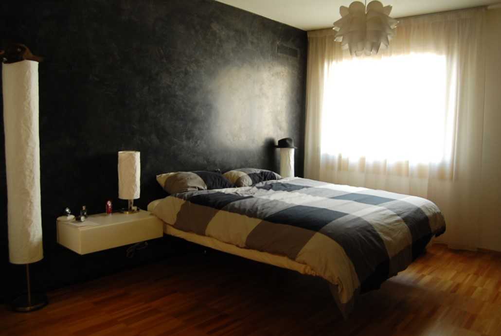 - Место, где люди отдыхают, должно быть теплым и уютным. Если решают сделать стильную серую стену в спальне, то лучше украсить ее картинами, молдингами, повесить шторы на окна, положить на пол шкуру, кровать застелить пушистым пледом.