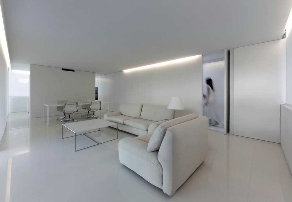 Необходимо отметить, что использовать можно не только различные оттенки серого цвета. Белые бетонные поверхности помогут зрительно расширить помещение, послужат отличным фоном для стильного интерьера. Безусловно, белый цвет является самым марким, но он открывает широкие возможности для оформления гостиной.