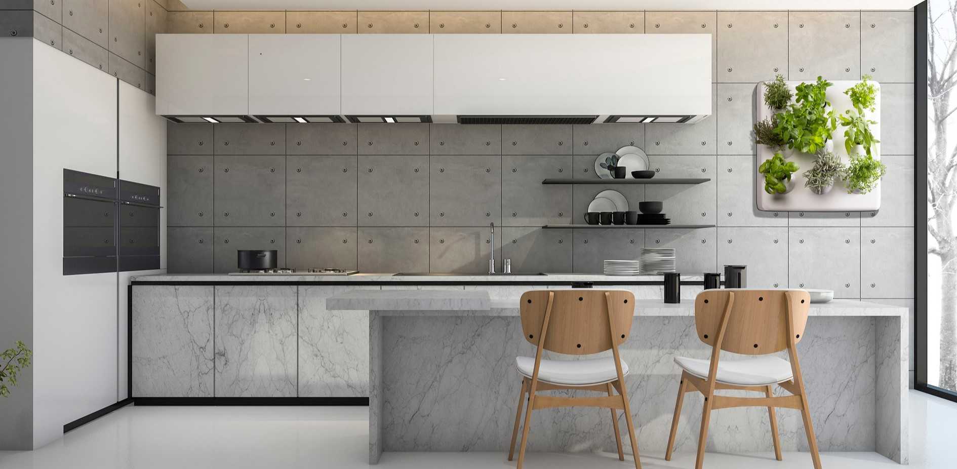 Комбинация бетона и древесины представляет собой отличное решение для интерьера кухни. Рабочую зону можно оформить с помощью бетона, дополнив интерьер деревянной барной стойкой или обеденным столом со стеклянной столешницей.