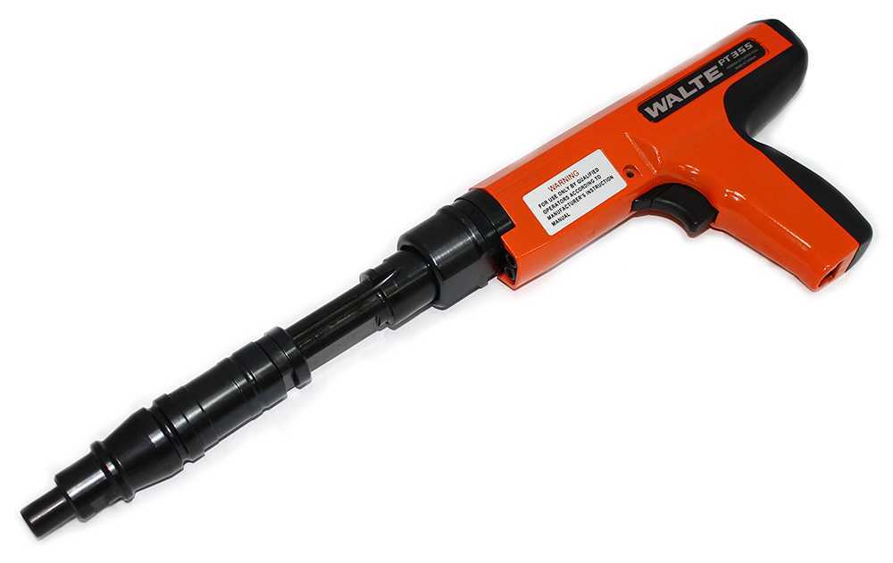 Выделяется особой мощностью, может использоваться для любых по твердости поверхностей. Но стоимость его высокая, также дорого стоят крепежи к нему. Мощная сила, с которой вылетают крепежи, требует от мастера специального умения, чтобы работы не заканчивались травмами. Поэтому для его использования необходимо получить разрешение.
