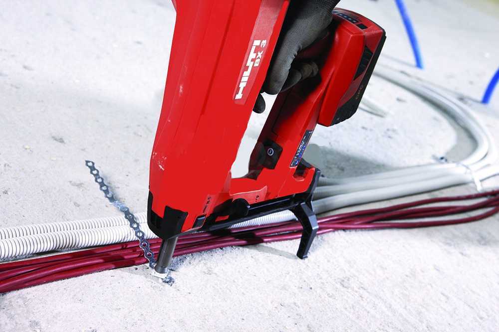 Так же стоит помнить, что при некоторых работах — например пристрелка пластиковых площадок для стяжек, не требуется полное заглубление гвоздя в материал. Если гвоздь будет заглубляться слишком сильно, то он разобьет пластиковое изделие своей шляпкой. Для таких работ необходимо подобрать длину гвоздя так, чтобы он не добивался до поверхности изделия, а кассета гвоздя, сделанная из эластичного пластика сминалась между изделием и шляпкой гвоздя и выполняла функцию поджимного демпфера, плотно прижимая прибиваемую площадку из пластика к поверхности бетона.