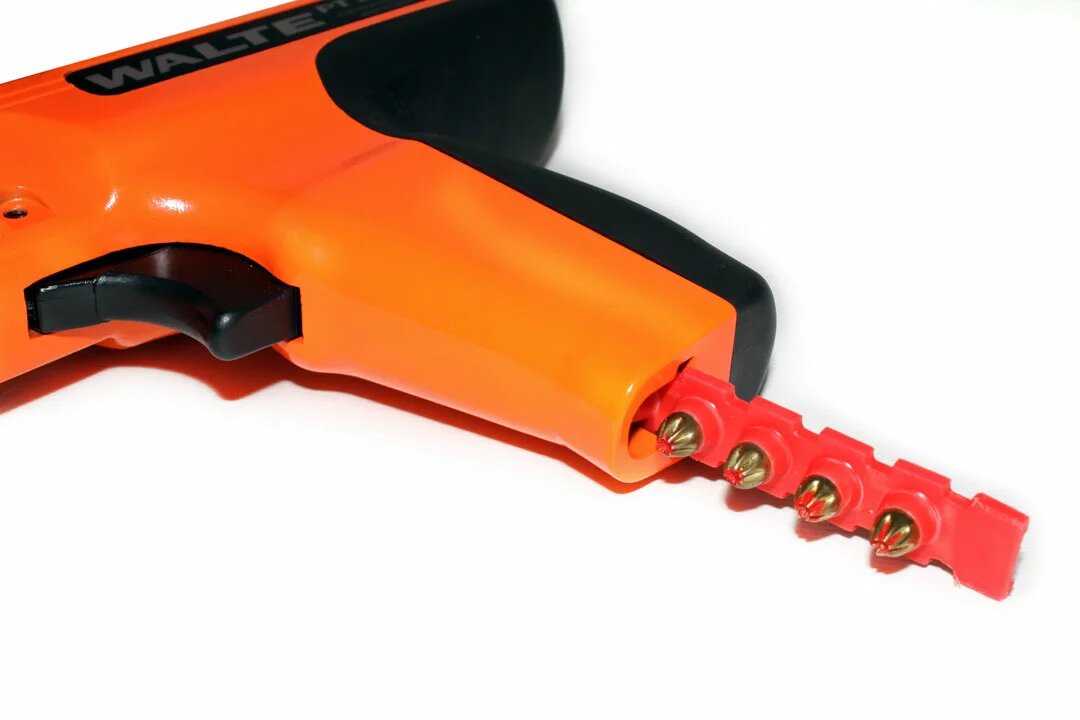 В носик пистолета вставляется крепеж, а в заднюю часть специальный холостой патрон.