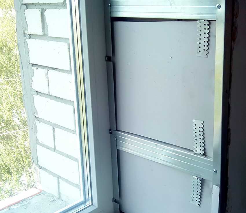 При каркасном методе установки на начальном этапе следует прикрутить стартовый профиль при помощи саморезов, как в случае с использованием сэндвич-панелей для оконных откосов. Он фиксируется на линии стыковки гипсокартонного листа и оконной рамы в паз. Своеобразный каркас готов, после чего можно приступать к монтажу.