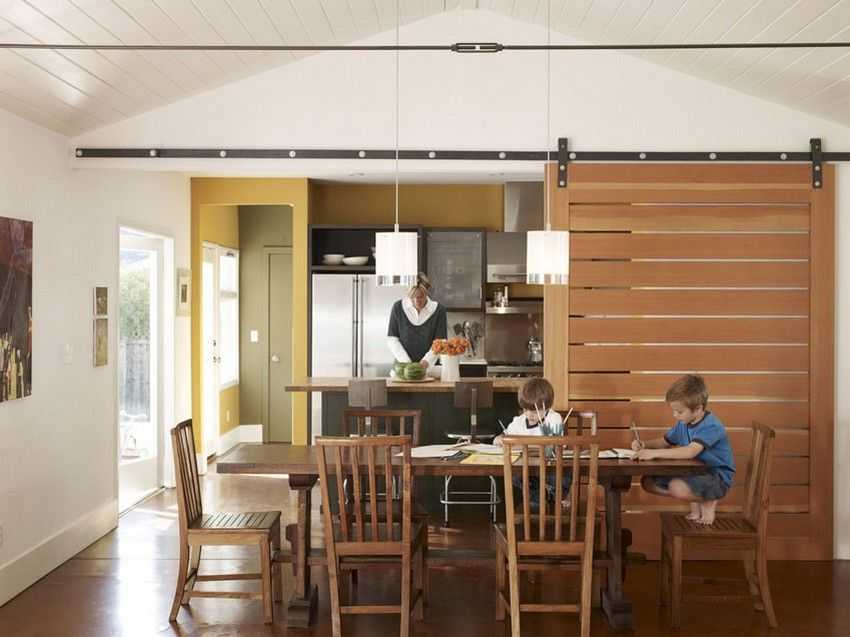 Имеется масса вариантов конструкций раздвижных систем, выполненных самостоятельно. Небольшую легкую раздвижную перегородку своими руками сделать можно из дверного полотна, конструкция которого подразумевает такое применение. Для этого, вместо распашного приспособления в виде петель или навесов, полотно оснащают роликовым механизмом. Если высоты двери недостаточно, можно из профилей собрать притолоку соответствующей ширины.