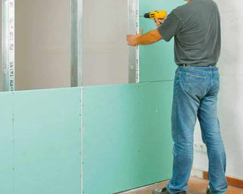 - Когда каркасная рама переборки для разграничения готова, потребуется взять ГКЛ, которым планируется облицевать боковину перегородочного элемента. Вначале лист размечают карандашом, а потом аккуратно обрезают электрическим лобзиком либо иным инструментом. Подобным образом формируют и еще один ГКЛ, которым облицовывается вторая сторона каркаса.
