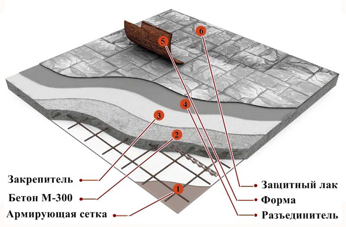 Раствор укладывается несколько выше уровня опалубки, чтобы выровнять поверхность можно было бы с легкостью. На один квадратный метр поверхности следует подготовить 2 кг краски. Штампы для печатного бетона укладываются через 5 часов после заливки раствора. Как только съем форм был завершен, зубилом-маркером следует обозначить швы. Уже через три дня бетон обретет прочность, по истечении этого времени с его поверхности смывается разделительный компонент, а ещё через 5 дней основание обрабатывается лаком-герметиком.