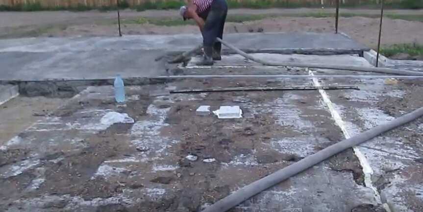 Перед началом работ по укладке полистиролбетона подготавливают основание. Укладка пола осуществляется на выровненную очищенную основу. Рабочий участок очищают от мусора и пыли и проверяют ровность с помощью строительного уровня. При наличии выступов их срезают, а впадины заливают раствором из цемента. Для увеличения шумоизоляции стен, соприкасающиеся части обклеивают демпферной лентой. После чего монтируют маячки с шагом в 100 мм. Как только подготовительные работы окончены, начинают делать раствор. Получившуюся смесь заливают водой и перемешивают до тех пор, пока раствор не примет консистенцию густой сметаны.