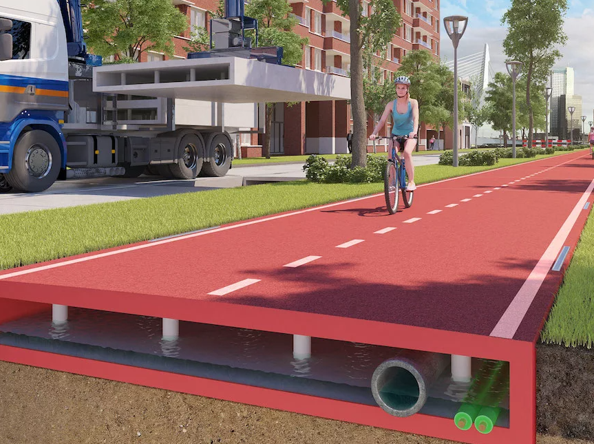 Пример успешного повторного использования сырья показала компания PlasticRoad из Нидерландов. Вместо асфальта они используют панели из переработанного пластика. Легкие, но прочные модули скрепляются между собой, а внутри них размещаются необходимые коммуникации. Срок службы таких дорог — несколько десятков лет. При этом после завершения использования материал вновь отправляется на повторную переработку.