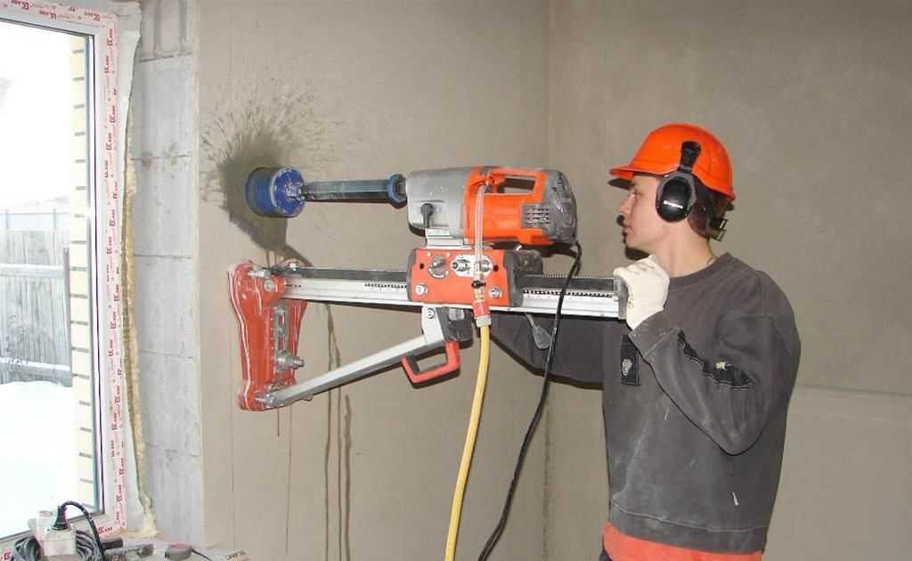 Фотография №5: сверление стены алмазной коронкой с фиксацией бура в горизонтальном положении