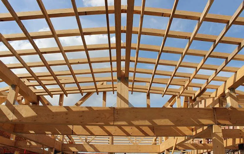Строительство таких домов более трудоёмко из-за того, детали конструкций крепятся с помощью врезных соединений. Но, существуют проекты небольших каркасных домов, в которых брусья крепятся на болты.