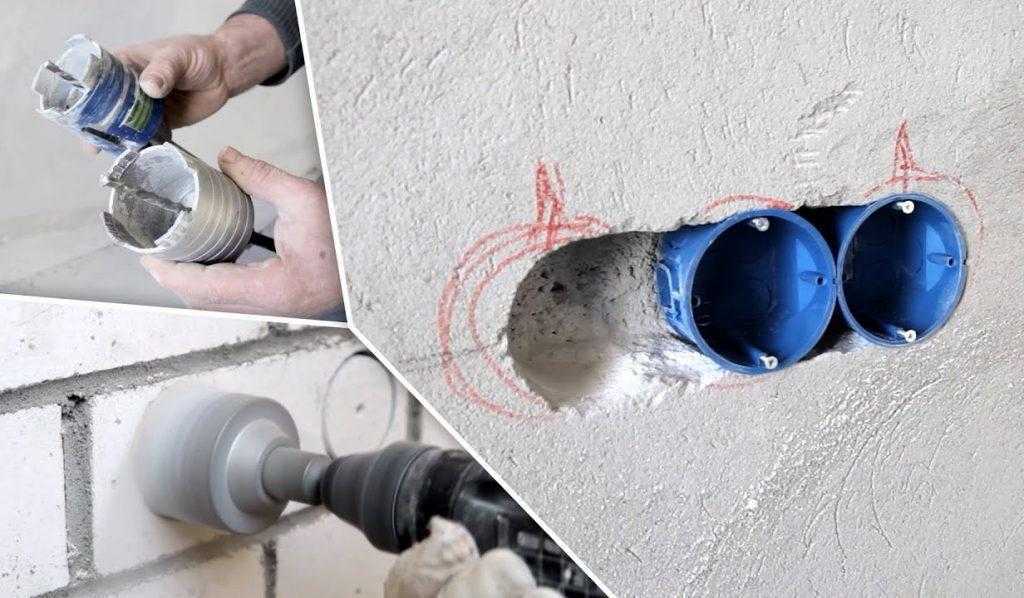 По черновой кирпичной стене сначала монтируется линия подключения розетки и выполняется выравнивающее оштукатуривание. Затем в проектном месте корончатым сверлом выполняют посадочное гнездо на нужную глубину.