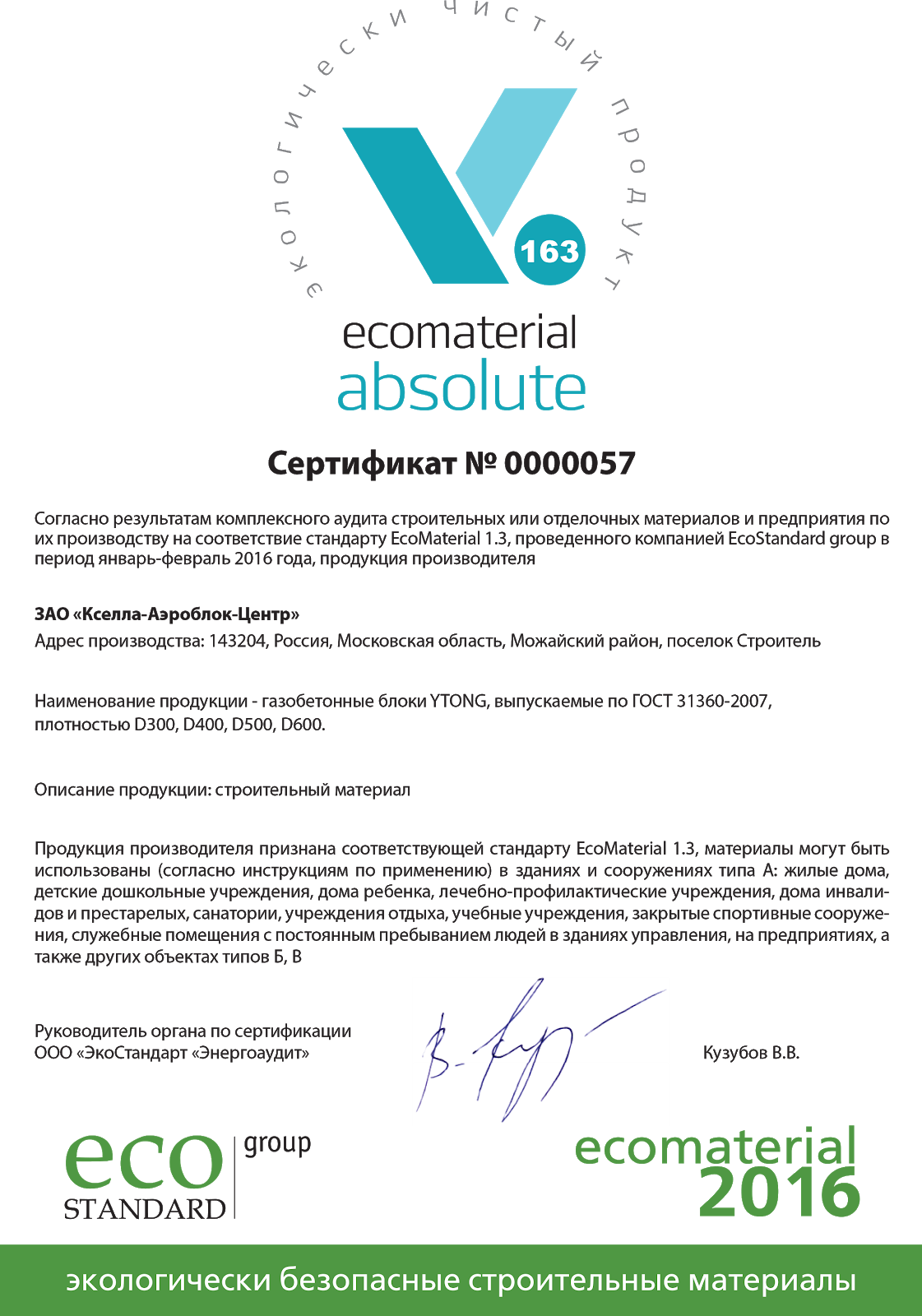 2. Экологический сертификат соответствия EcoMaterial. Это независимый российский стандарт, оценивающий стройматериалы на основании законодательных актов РФ, ISO 14024, требований Всемирной организации здравоохранения, стандартов DGNB, BREEAM, LEED, рекомендаций международных организаций по «зеленому строительству». Согласно сертификату, продукция YTONG соответствует стандарту EcoMaterial 1.3. Это означает, что из неё можно строить жилые дома, детские дошкольные учреждения, лечебно-профилактические учреждения, санатории, дома инвалидов и престарелых, учебные учреждения, закрытые спортивные сооружения, служебные помещения, где постоянно находятся люди, и пр.