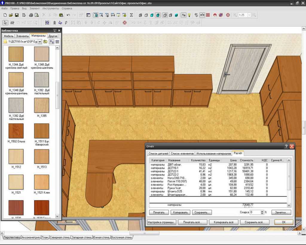 Профессиональный редактор, в котором можно создавать макеты помещений, выполнять отделку, проектировать мебель и выполнять расчёт стоимости работ. PRO100 хорошо подходит для фабрик и других крупных организаций, которым требуется многофункциональный инструмент для профильной деятельности. Для частных лиц, которые профессионально не занимаются дизайном помещений, интерфейс с обилием инструментов может показаться достаточно сложным, а цена — слишком высокой (например, PRO100 v.6 Professional стоит 83842 руб).