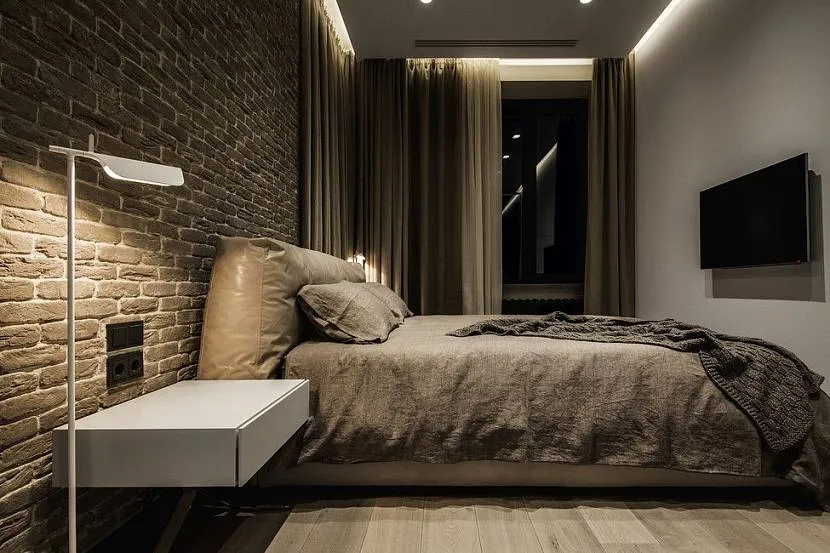 Одновременно старинный и современный стиль. Подходит для узких спален с окнами и без. Характерная черта — наличие кирпичной стены. Если такой эффект организовать невозможно, выполняют имитацию. Ее создают с помощью кусочков пенопласта или специальных пластиковых панелей.