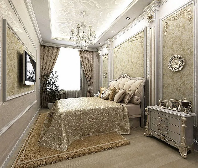 В таком направлении приветствуется симметричность линий, изящные дополнения, возможно лепнина. Спальный гарнитур строго белого или кремового цвета с глянцевой фактурой. Такие детали отражают окружающую обстановку, помещение приобретает свежесть и легкость.