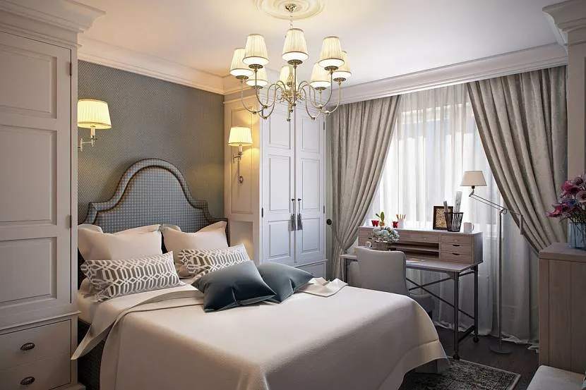Классическая узкая спальня с кроватью и рабочей зоной у окнаИсточник yandex.ru