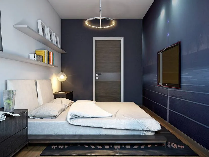 Небольшая спальня в стиле минимализм подразумевает размещение функциональной мебели. Допускается совмещение зеркал, выезжающих створок и шкафчиков. Рекомендуют в дизайн узкой спальни встраивать полки, тумбочки и ящики. Все эти детали должны быть выдержаны в едином оттенке. Фурнитура каждого из предметов должна соответствовать интерьерному решению: никаких вычурных деталей, фигурных ручек.