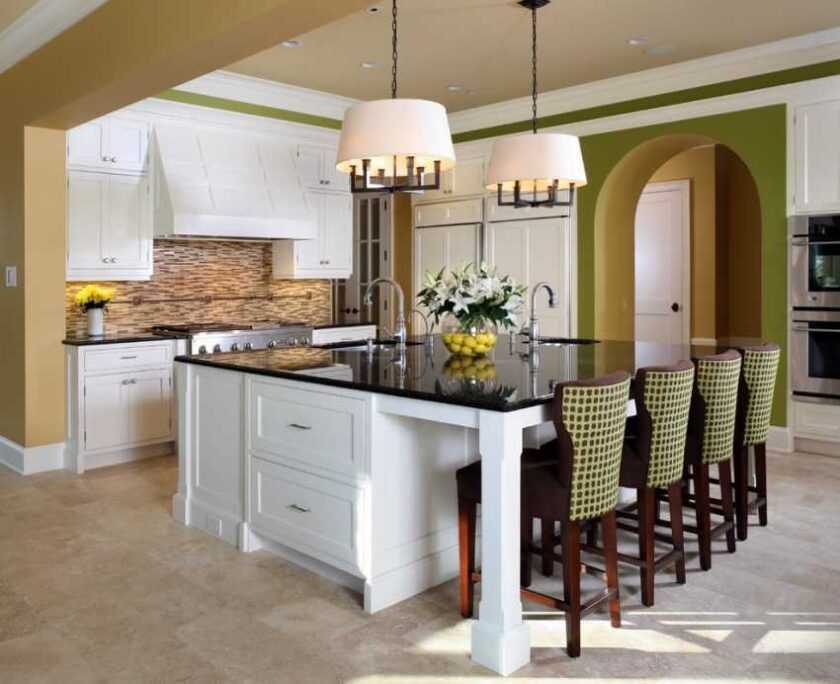 - Фигурный свод в большой кухне желательно акцентировать в контрастных тонах. Эффектно смотрится отделка структурной штукатуркой.