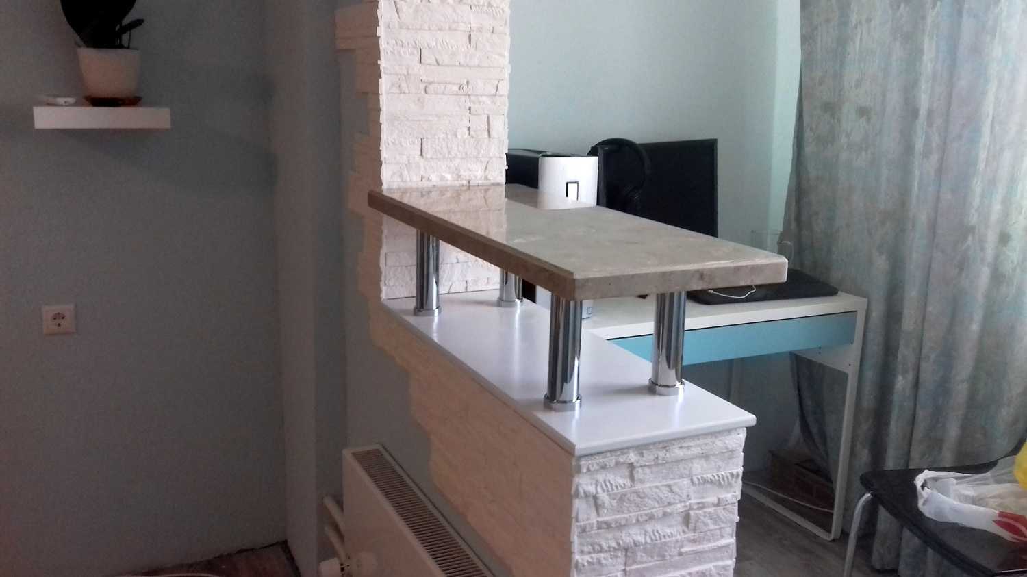 - Выбор материалов. Барная плита может быть из любого материала. Хорошо смотрится как экономичный вариант из ДСП, так и тяжелая каменная конструкция.