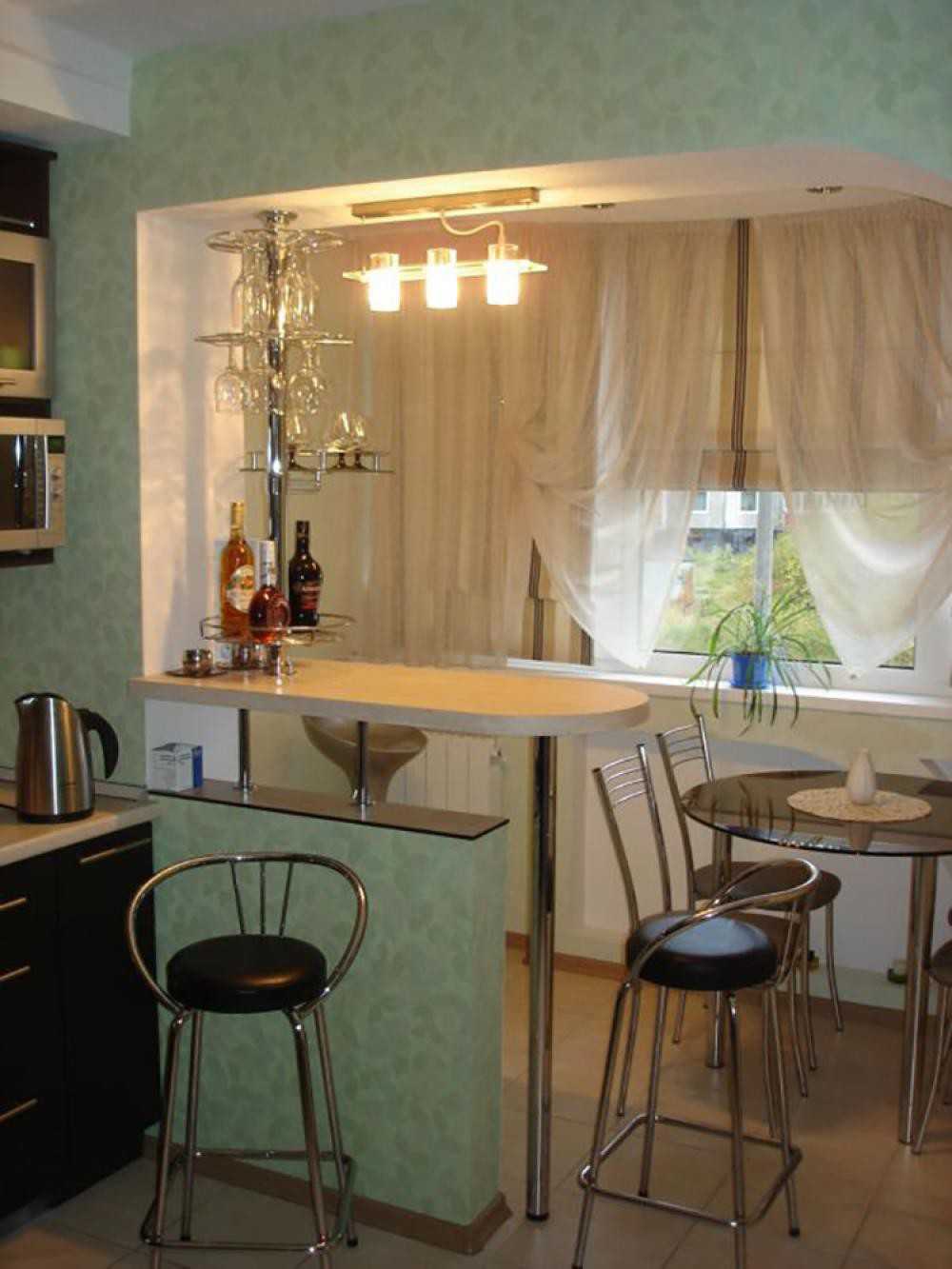 Барная стойка добавляет всему интерьеру нотки модерна, потому уместно будут смотреться металлические оттенки штор, стульев и стен. Хорошо подойдет неоновая подсветка, можно вывести динамики для спокойной музыки и интересной атмосферы.