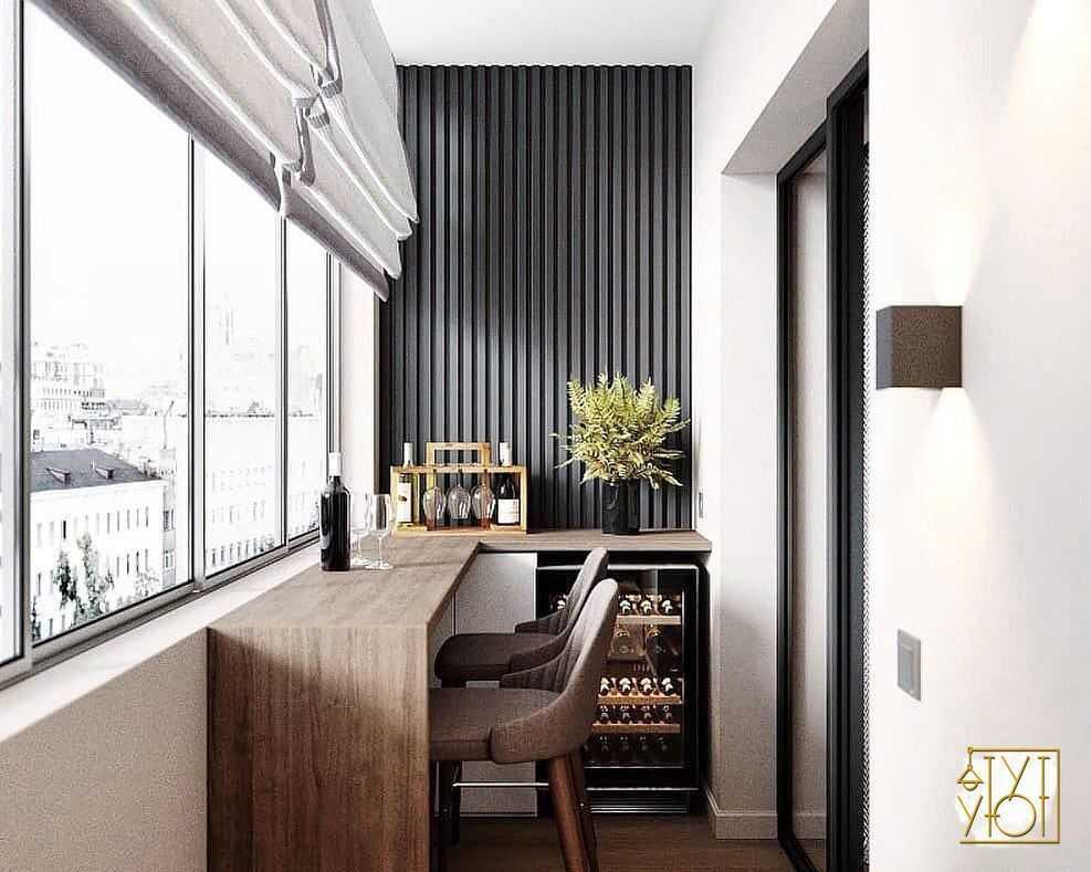 Барная стойка на кухне или в квартире-студии стала привычным элементом интерьера. Однако это не единственный вариант размещения такого стола. Стойка на балконе станет свежим дизайнерским решением, отличающимся практичностью и функциональностью. Такой вариант уместен на узких лоджиях, где присутствует дефицит свободного пространства. Предмет мебели занимает мало места и подходит для интерьеров в стиле модерн.