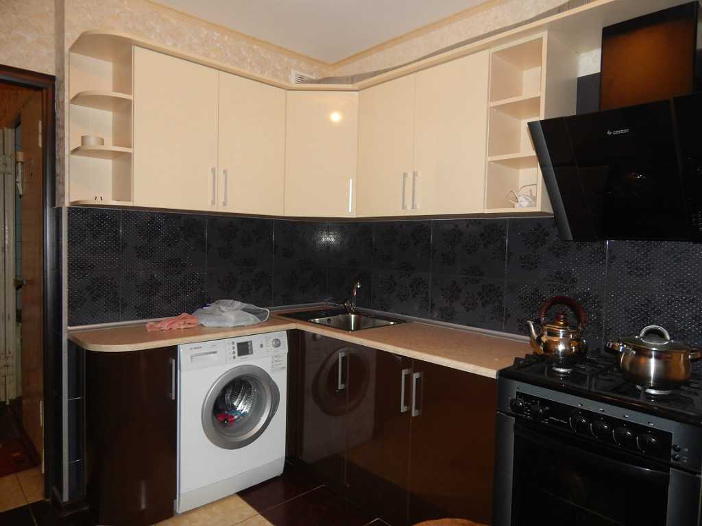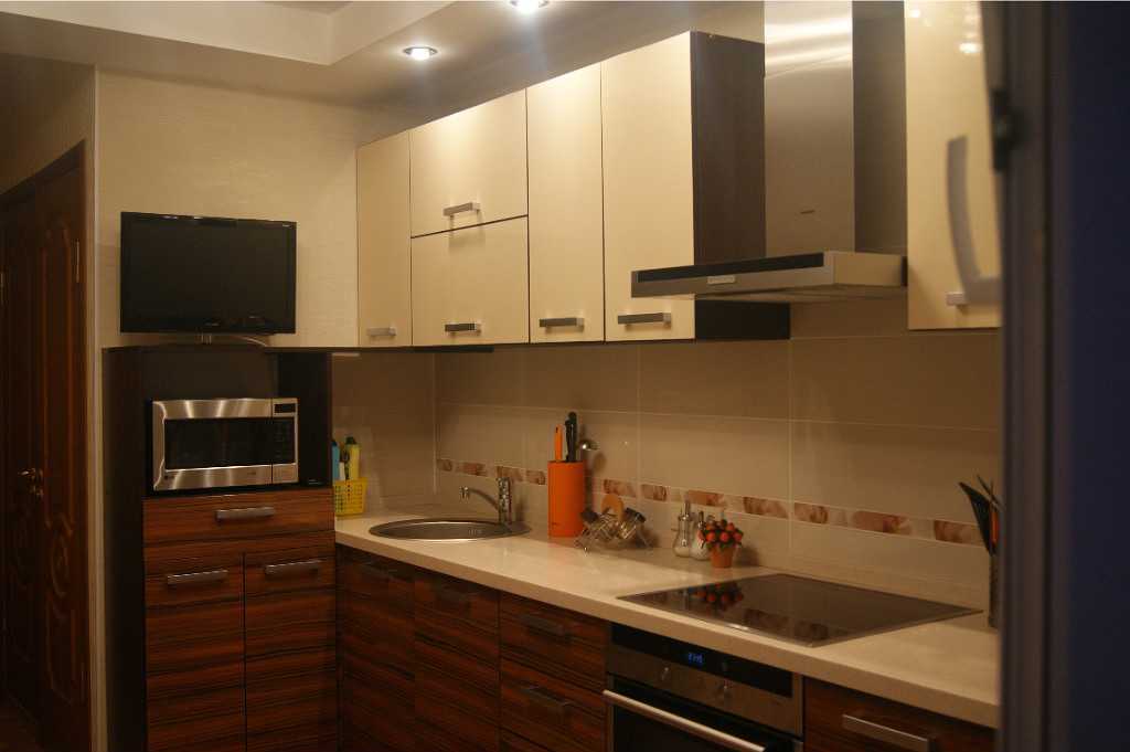 Если мебель приобретается для небольшой квартиры-студии, следует отдать предпочтение угловым моделям, которые удачно впишутся в кухню маленького размера. Такая конфигурация предполагает возможность для встраивания различной техники. Данные модели хорошо смотрятся и в более просторных помещениях. Заполнить излишек пространства можно путем увеличения количества секций кухонной мебели.