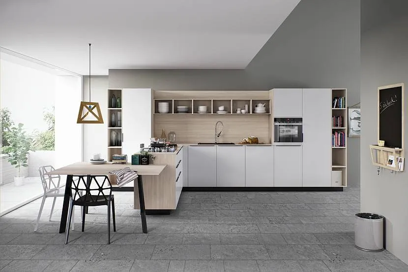 - Визуальное расширение пространства, что позволяет использовать этот цвет в малогабаритных кухнях. Большое пространство нежелательно оформлять исключительно в белом цвете, намного интересней будет разбить помещение на отдельные зоны, например, с помощью разных оттенков напольного покрытия.