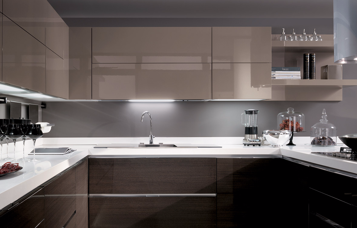 Обычно глянцевые гарнитуры изготавливают в двух цветах. Нижний ярус более темный, а навесные конструкции светлее.