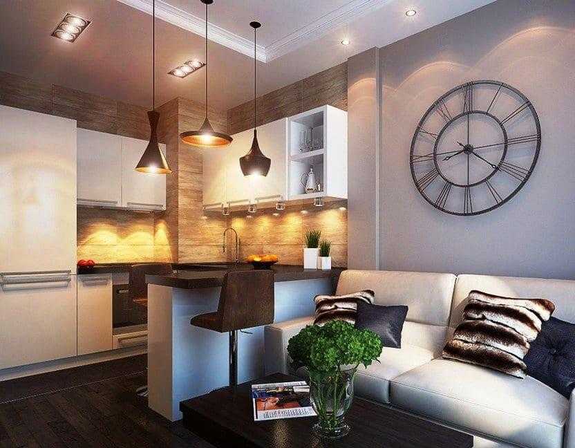 - подчеркивают дизайн кухни гостиной в 2022 году разнообразием светильников, позволяющих визуально разграничить функциональные зоны.